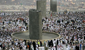 ♦第一步:来到米纳的石柱区域,从最小的石柱(al-Jamrah as-Sughra)开始,将七颗石子一次一颗的掷出,并且在每次投掷时诵念︰